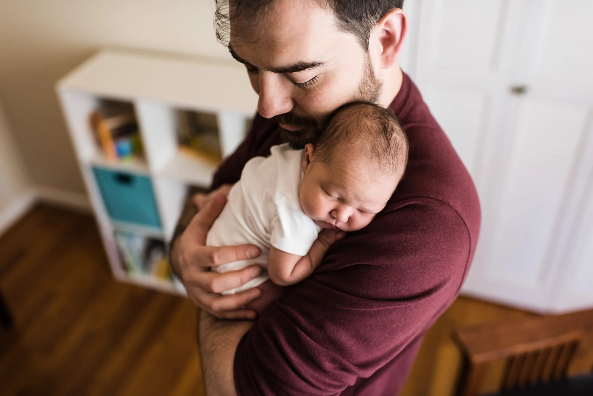 Lifestyle newborn sessions do not include props or traditional posed baby images.